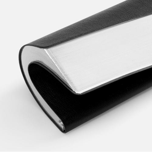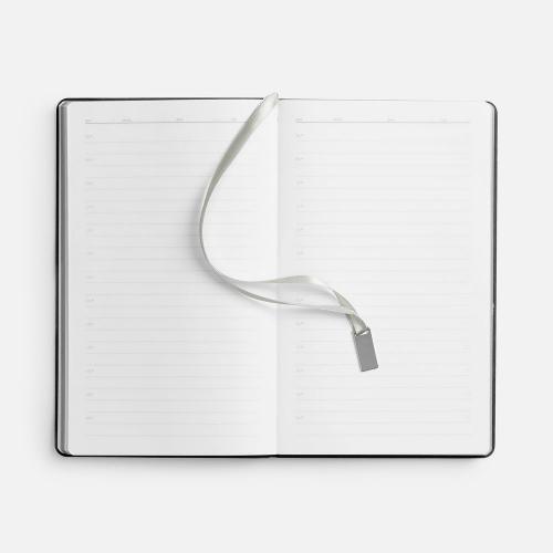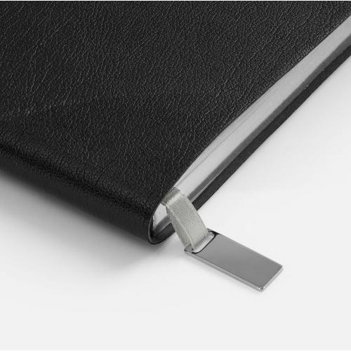 Ежедневник с гибкой обложкой, выполнен из материала Petrus, черный АА, дополнен серым ляссе с металлическим шильдиком.