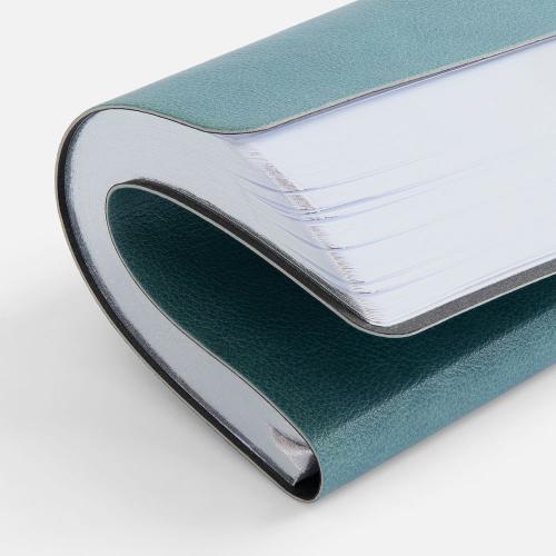 Ежедневник с гибкой обложкой, выполнен из материала Petrus, голубой JJ, дополнен серым ляссе с металлическим шильдиком.