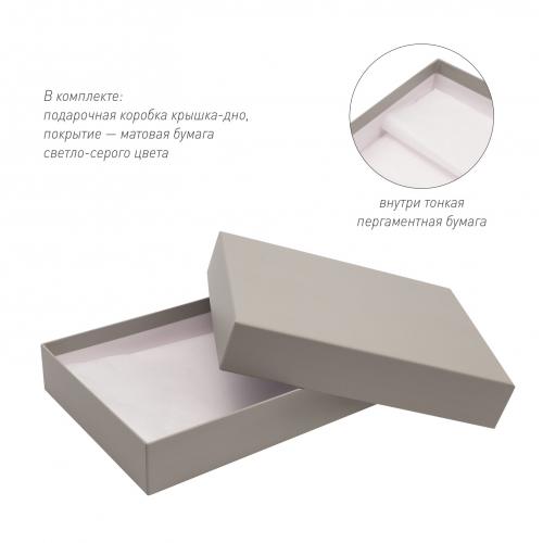 Упаковка: подарочная коробка крышка-дно светло серого цвета. Внутри дополнительная упаковка в тонкую пергаментную бумагу.