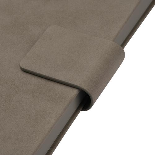 Оригинальный квадратный магнитный клапан надежно фиксирует обложку. Внутри — кремовые страницы из гладкого шелковистого офсета со скругленными уголками, форзац и нахзац, а также срез в тон обложки, создают гармоничное сочетание. Элегантное атласное ляссе дополняет изысканный образ.