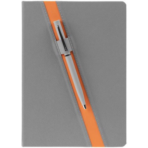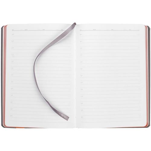 Ежедневник с твердой обложкой и тонированным обрезом. Выполнен из материала Nice Touch, серый СС, и Soft Touch, оранжевый ОО, дополнен серым ляссе.