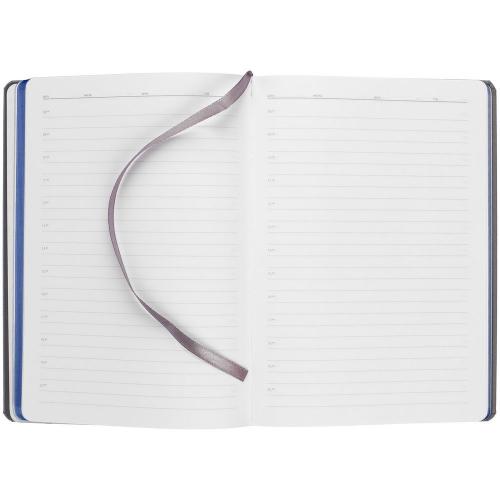 Ежедневник с твердой обложкой и тонированным обрезом. Выполнен из материала Nice Touch, серый СС, и Soft Touch Ultra, синий НН, дополнен серым ляссе.