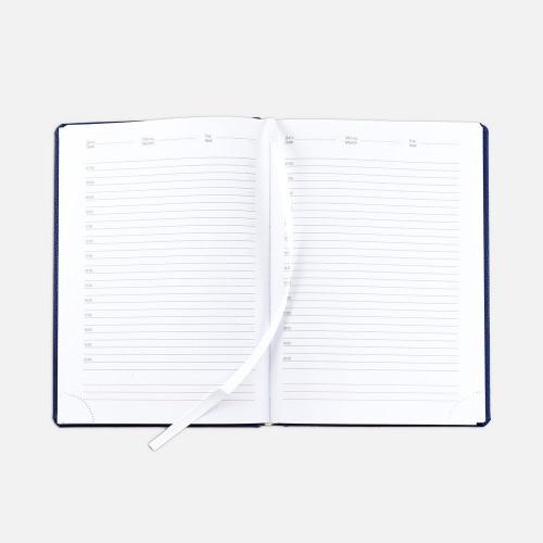 Ежедневник в твердой обложке c поролоном, выполнен из материала La Fite, синий НН, дополнен ляссе белого цвета.