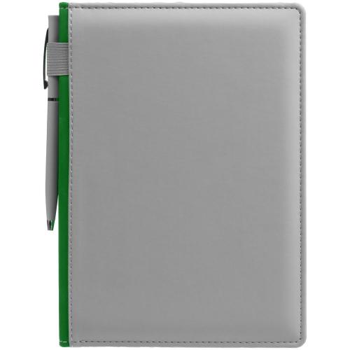 Твердая обложка с поролоном, материал обложки — Soft Touch, серый СС и Soft Touch Ultra, зеленый FF. На корешке ежедневника находится петля из резинки.