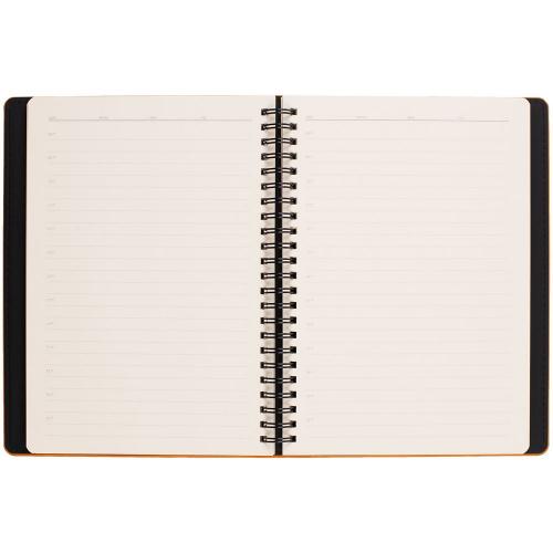 Ежедневник с блоком на пружине в твердой обложке, выполнен из материалов Nubuk Touch, оранжевый ОО и Soft Touch, черный AA.