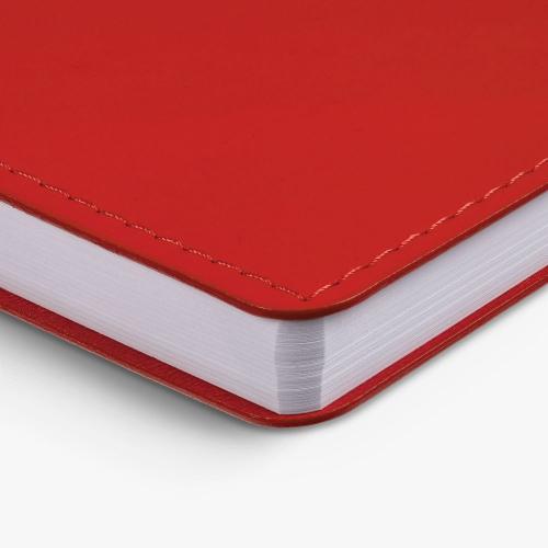 Ежедневник с гибкой обложкой из материала Soft Touch Ultra, красный РР и Latte, красный (внутренний материал), дополнен петелькой для ручки из покровного материала, капталом, ляссе и закрашенным срезом обложки в цвет материала.