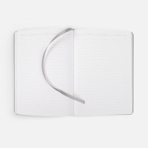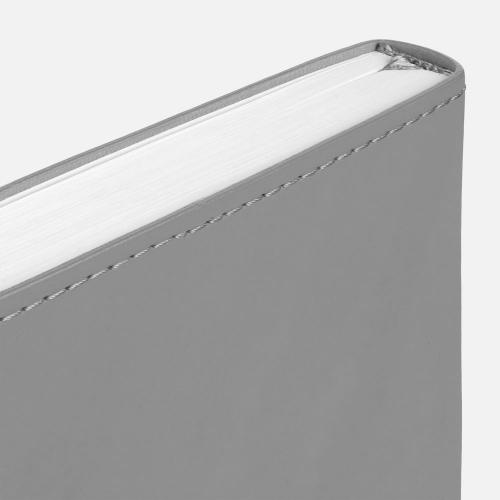 Ежедневник с гибкой обложкой из материала Soft Touch, серый СС и Latte, серый (внутренний материал), дополнен петелькой для ручки из покровного материала, капталом, ляссе и закрашенным срезом обложки в цвет материала.