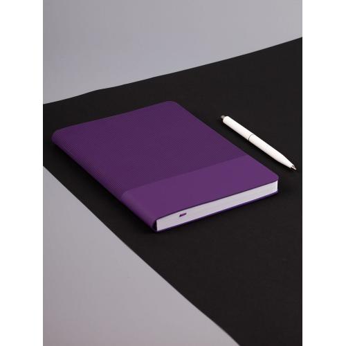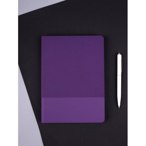 Ежедневник с гибкой обложкой выполнен из материала Soft Touch, фиолетовый UU и Latte, фиолетовый (внутренний материал); дополнен ляссе фиолетового цвета и фактурным тиснением обложки.