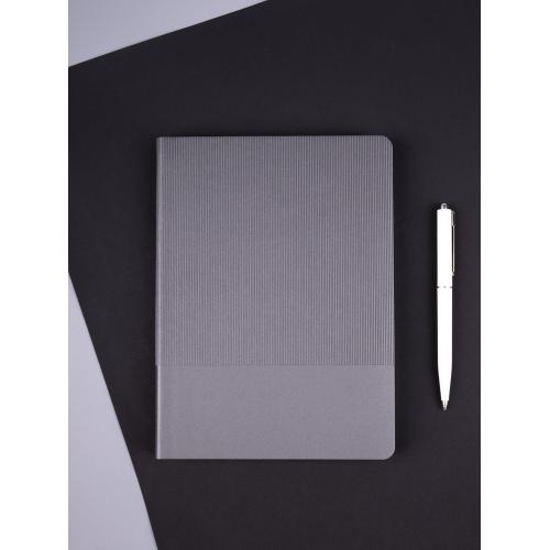 Ежедневник с гибкой обложкой выполнен из материала Soft Touch Perl, серый СС и Latte, серый (внутренний материал); дополнен ляссе серого цвета и фактурным тиснением обложки.