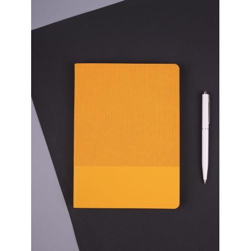 Ежедневник с гибкой обложкой выполнен из материала Soft Touch, желтый KK и Latte, желтый (внутренний материал); дополнен ляссе желтого цвета и фактурным тиснением обложки.