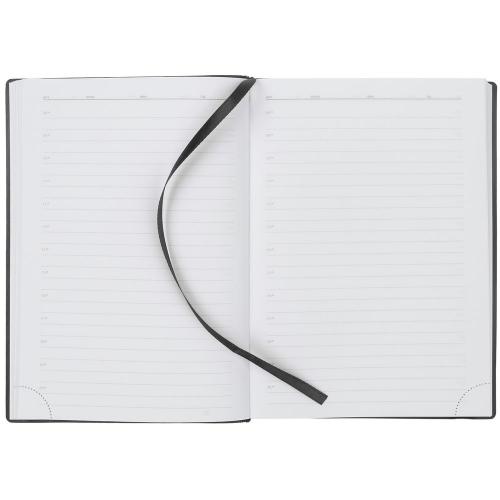 Ежедневник с гибкой обложкой выполнен из материала Brand, черный АА, и дополнен резинкой шириной 1 см с металлическим шильдом, капталом, ляссе черного цвета.