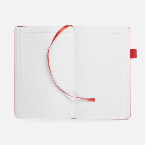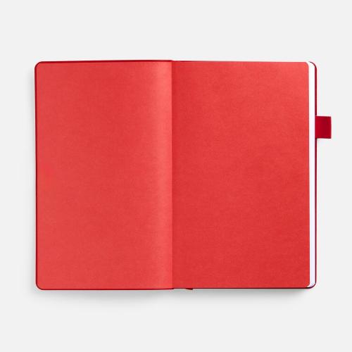 Гибкая обложка, материал обложки — Soft Touch, белый BB; внутренний материал — Latte красный РР; материал петли для ручки — Nice Touch Ultra, красный РР. Срез обложки окрашен в красный цвет.