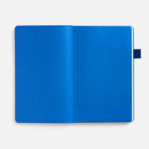 Гибкая обложка, материал обложки — Soft Touch, белый BB и Latte, синий НН; материал петли для ручки — Nice Touch, синий НН. Срез обложки окрашен в синий цвет.