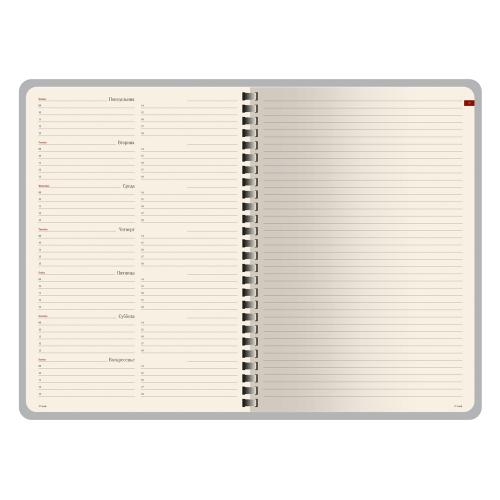 Деловые еженедельники Concept - это воплощение современного дизайна, в котором сочетаются практичные детали. Благодаря удобному формату slim-pocket еженедельник легко помещается в сумку. Еженедельник Concept в классической серой обложке формата А5. Практичный, привлекательный и приятный на ощупь материал обложки на протяжении всего срока службы сохраняет презентабельный вид. Уголки обложки имеют закругленную форму, по всему периметру сделана прострочка нитками в тон. Недатированный блок состоит из 128 страниц, укреплённых на пластиковом полускрытом гребне. На 21 странице размещена справочная информация на русском языке. День недели указан на русском и английском языках. Блок является сменным и вставляется внутрь обложки. С внутренней стороны обложка имеет вырубные отделения для визиток и кредитных карт, а также петлю для ручки на резинке. Для хранения чеков, записок и бумаг внутри расположен прозрачный пластиковый конверт.