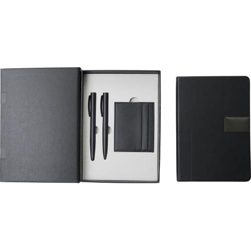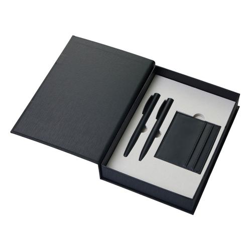 Goethe - это премиальный подарочный набор в коробке, закрывающейся на магнит. Комплект включает две ручки — шариковую и роллер — с высококачественными синими немецкими чернилами Dokumental и пишущими узлами Premec (в шариковой). Их дополняет картхолдер из экокожи на 4 карты с отделением для наличности. Завершает этот комплект блокнот в твердой обложке из искусственной кожи. Внутри него 96 листов кремовой бумаги с FSC-сертификатом плотностью 80 г/м2.