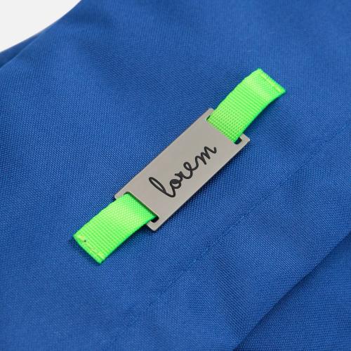 Шильдик не пришивается на изделие самостоятельно, его необходимо надеть на шнурок, кожаный лейбл или текстильную стропу. Добавьте нанесение «Крепление (кастомизация)» и сделайте его групповым для всех товаров, которые необходимо соединить.