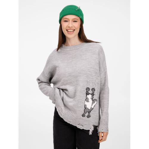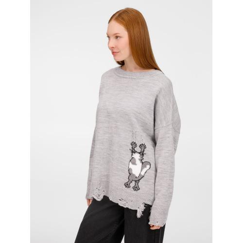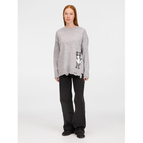 В дизайне мягкого джемпера с круглым вырезом Sharpick гранж-эстетика органично сочетается с милым акцентом — пушистым рисунком в виде озорного котика. Получается веселая вариация на тему того, откуда берется модная рваная одежда, а джемпер моментально создает настроение легкой несерьезности. Рваные края изделия добавляют современную нотку, а резинка на вороте, манжетах и по низу обеспечивает удобную посадку.