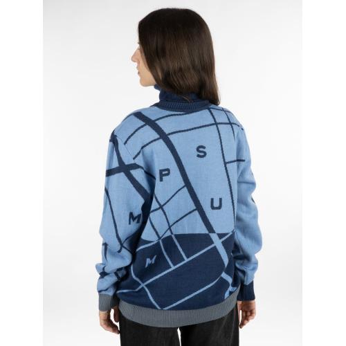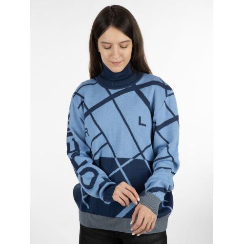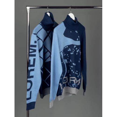 Свитер с вывязанным логотипом и индивидуальным рисунком в фирменной цветовой гамме.