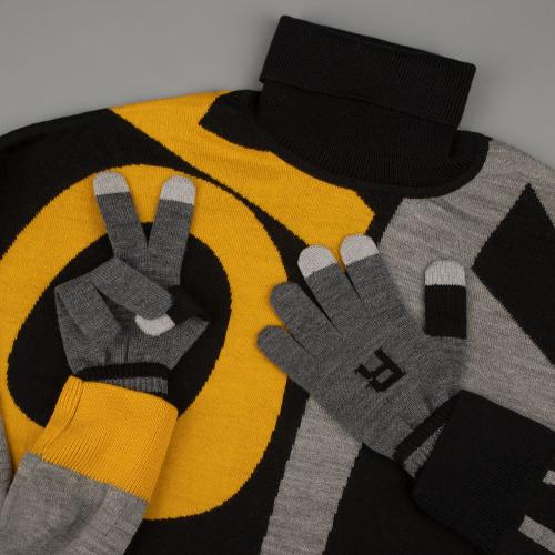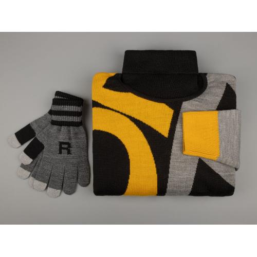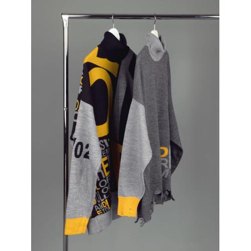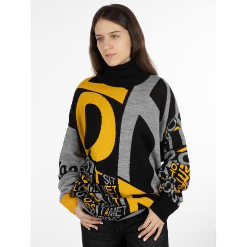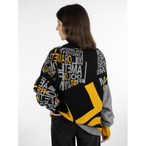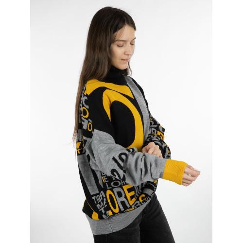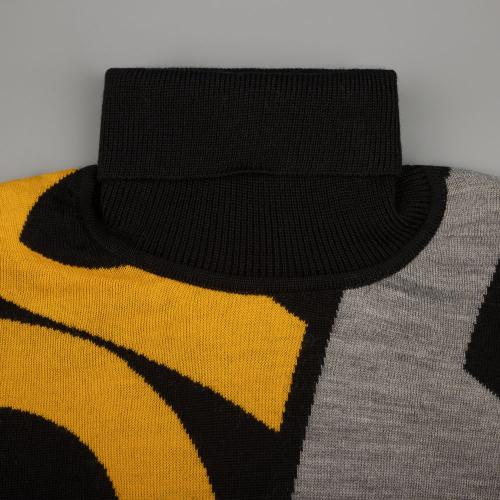 Свитер унисекс с вывязанным логотипом и индивидуальным рисунком в фирменной цветовой гамме.