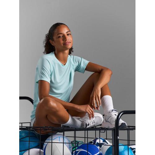 Женская спортивная футболка из дышащего и быстросохнущего материала. Приятная на ощупь и легкая ткань не стесняет движений.