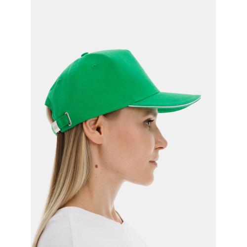 Модель бейсболки с 5-ю клиньями без лобового шва из плотного чесаного хлопка.