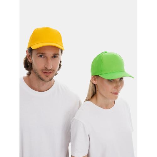 Модель бейсболки с 5-ю клиньями без лобового шва из плотного чесаного хлопка.