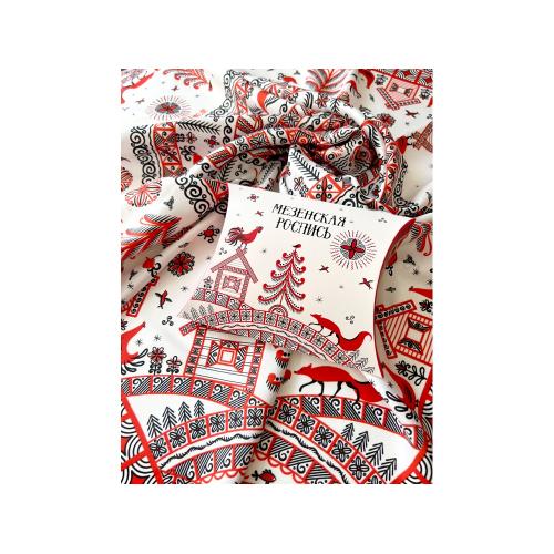 Самобытный орнамент знаменитой мезенской росписи, отличающейся зашифрованным символизмом, лег в основу элегантного платка Мезенская роспись. Петух и лиса. Каждый элемент принта имеет особое значение, и располагается в строго определенном месте, создавая целый рассказ. Ранее такими рисунками украшали избы, посуду и кухонную утварь, передавая послание поколениям.