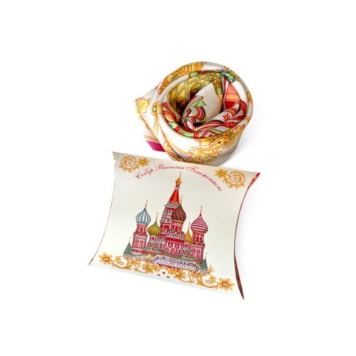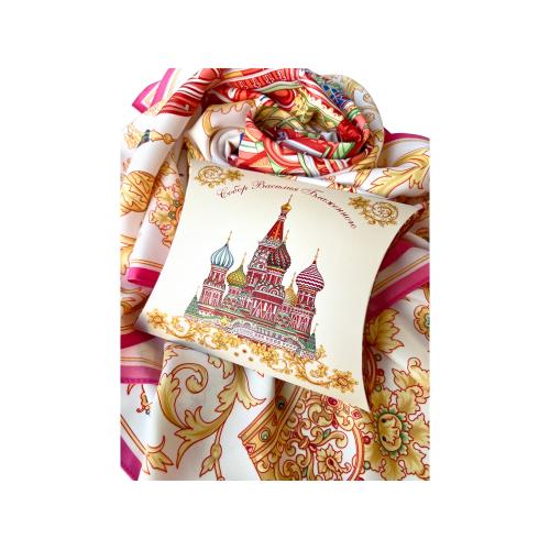 Сказочный вид собора отражен на золотом фоне новинки от бренда Русские в моде by Nina Ruchkina. Настоящее восьмое чудо Света обрамлено царскими коронами и райскими птицами, свидетельствующими об уникальности и роскоши этой исторической достопримечательности, отстроенной 1 октября 1552 года на праздник Покрова Богородицы.