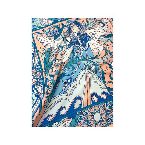 В центре авторского принта — удивительной красоты женщина с белоснежными крыльями, наделенная магическими способностями и житейской мудростью. Оригинальное сочетание тонов, цветочных орнаментов и русского колорита делают аксессуар нежным и самобытным.