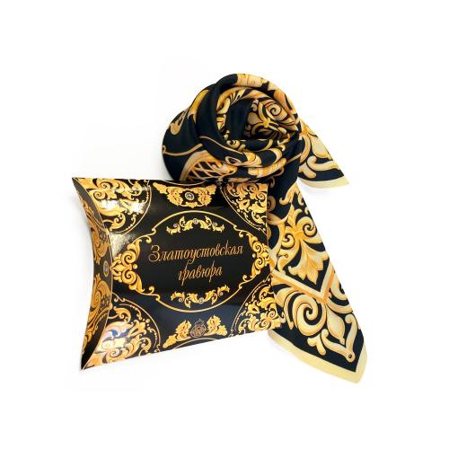 Дамы и господа, вы держите в руках платок Златоустовская гравюра, дизайн которого сделан совместно с авторами художественных мастерских Лик.