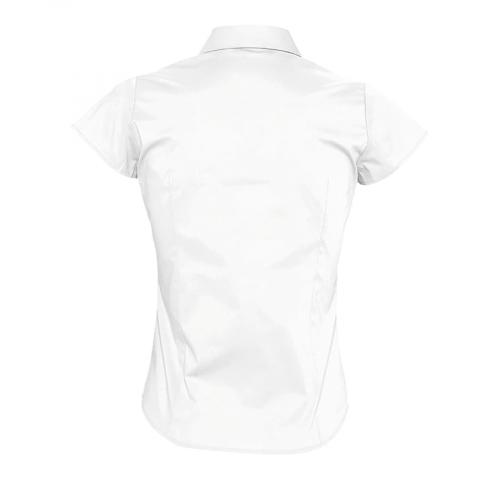 Женская рубашка с коротким рукавом из ткани стрейч. Приталенный крой. Планка на 7 пуговиц в тон изделия. Вытачка спереди и на спинке.