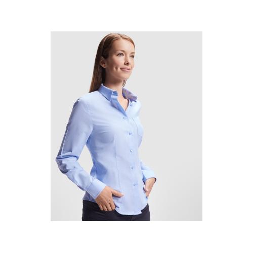 Женская рубашка с длинным рукавом, накладной карман слева. Планка на пуговицах. Отложной воротник на стойке, могут встречаться изделия, где воротник продублирован пуговицами. Манжета регулируется по ширине с помощью 2-х пуговиц. Кокетка на спинке.