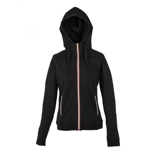 Комфортная женская толстовка худи на молнии LAS VEGAS LADY Худи с приталенным силуэтом из футера с начёсом, плотностью 280 г м² и смесовым составом: 80% хлопка и 20% полиэстера. С таким составом изделия не деформируются и служат долго. Капюшон с подкладом и удобным высоким воротником-стойкой. Шов горловины усилен мягкой лентой Низ толстовки и рукава из эластичной рибаны. Основная молния и молнии в боковых карманах - контрастные.   Материал: футер с начёсом, 80% хлопка и 20% полиэстера, 280 г м².