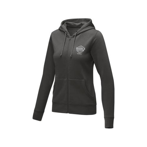 Женская толстовка на молнии Theron. Основная этикетка, которую можно оторвать или отрезать, без неудобных пришитых ярлыков. Завязки на капюшоне. Расположенная по центру молния. Карман кенгуру. С подшивкой из гладкого трикотажа в рубчик. С манжетами из гладкого трикотажа в рубчик. Внутренняя сторона покрыта ворсом. Тесьма из основного материала по внутренней стороне горловины. Придающие форму швы и зауженная талия для ровного прилегания. Трикотаж 50% Хлопок, 50% Полиэстер, 240 g/m2.