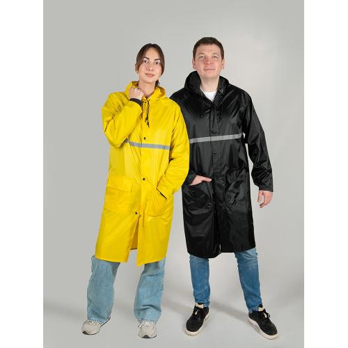 Длинный дождевик выполнен из полиэстера с водоотталкивающей пропиткой. Застегивается на молнию, поверх которой — планка на кнопках, что дополнительно защищает от ветра и промокания. Посадку капюшона можно регулировать при помощи шнурка, ширина рукава регулируется кнопкой. Светоотражающая тесьма на груди и спине делает человека в плаще заметным даже в темное время суток. Вместительные накладные карманы защищены сверху клапаном. Дополнительная проклейка швов дождевика обеспечивает большую степень водонепроницаемости. - водонепроницаемость обеспечивается водоотталкивающей пропиткой материала и дополнительной проклейкой швов - светоотражающие элементы делают человека заметным в темное время суток - вместительные накладные карманы