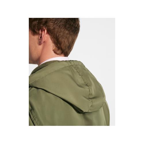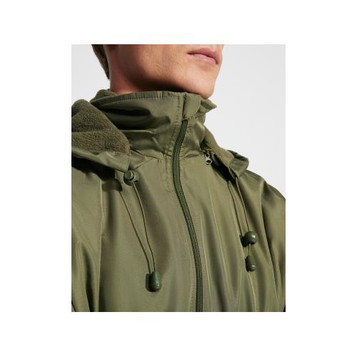 Легкая водонепроницаемая куртка. · Высокий воротник и складывающимся капюшоном с регуляторами. · Подкладка из микрофлиса. · Центральная застежка·молния и защита для подбородка. · Эластичные манжеты. · Два боковых кармана на застежке·молнии. · Внутренний левый нагрудный карман.