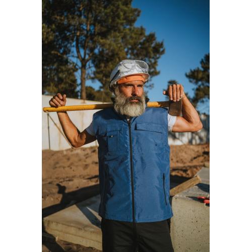 Мужской утепленный жилет с воротником-стойкой и удлиненной спинкой. Выполнен из ткани оксфорд с водоотталкивающим покрытием.