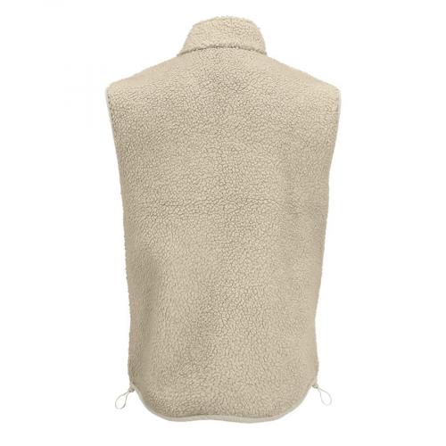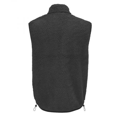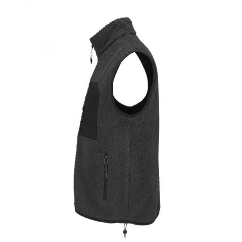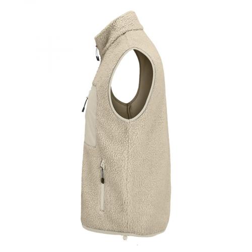 Жилет унисекс из искусственного меха шерпа с карманами на молнии: 1 нагрудным из таслана для нанесения логотипа и 2 боковыми. Черные пуллеры на молниях со светоотражающими элементами. Слегка удлиненная спинка. Эластичный шнурок по низу изделия.