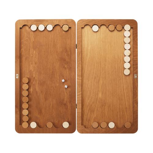 В комплект входят фишки из фанеры двух оттенков, гармонирующих с базовым цветом доски.