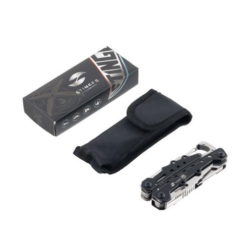 МНОГОФУНКЦИОНАЛЬНЫЙ ИНСТРУМЕНТ STINGER С НАБОРОМ ИЗ 12 ФУНКЦИЙ: 1. Острогубцы   2. Пассатижи 3. Кусачки 4. Лезвие большое плоское 5. Пила по дереву 6. Отвёртка крестовая 7. Отвёртка шлицевая большая 8. Инструмент для снятия изоляции 9. Стропорез 10. Открывалка для бутылок 11. Консервный нож 12. Карабин ХАРАКТЕРИСТИКИ: Материал инструментов: нержавеющая сталь 3Cr13 Материал рукояти: нержавеющая сталь Длина: 105 мм Ширина: 40 мм Вес: 261 г В комплекте: чехол из синтетического материала Упаковка: картонная коробка