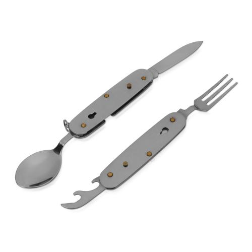 В нем есть все, что необходимо - ложка, вилка, ножик, открывалка бутылок и жестяных банок. Также имеется удобное кольцо для подвешивания. Набор разделяется на две части.