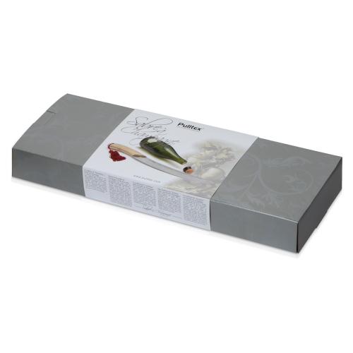 Сабраж — это необычный и очень зрелищный способ открывания шампанского, при котором горлышко бутылки не откупоривается, а сбивается вместе с пробкой. Сабля для сабража от Pulltex, испанского производителя аксессуаров для вина, создана специально для этой цели с учетом всех особенностей процесса: удобная ручка, плоское лезвие, изогнутое специально под горлышко. Рукоять выполнена из дерева, благодаря чему обеспечивается удобный хват, а кисть бордового цвета и нарядный деревянный футляр дополняют саблю, придавая ее облику торжественность.
