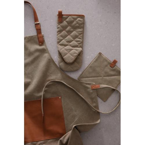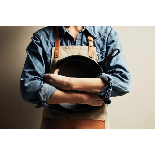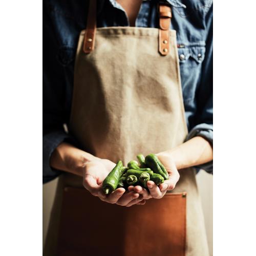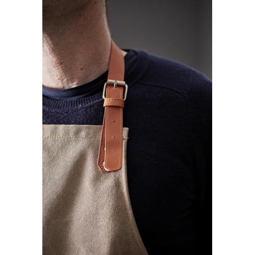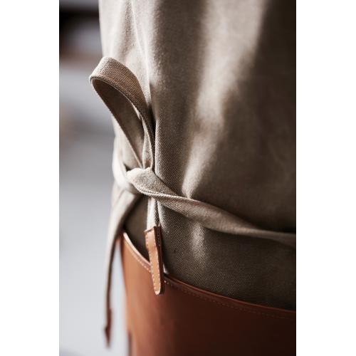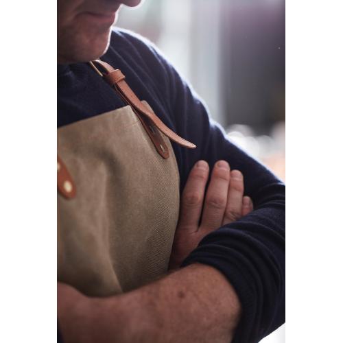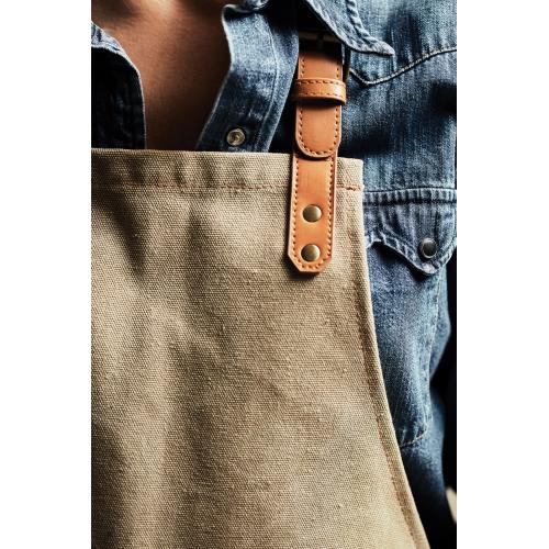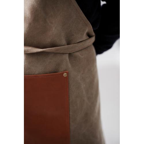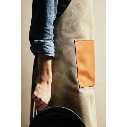 Прочный фартук из вареного канваса плотностью 500 г/м² декорирован деталями под натуральную кожу. Благодаря текстуре ткани со временем изделие становится только лучше.
