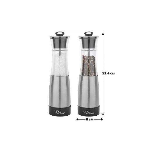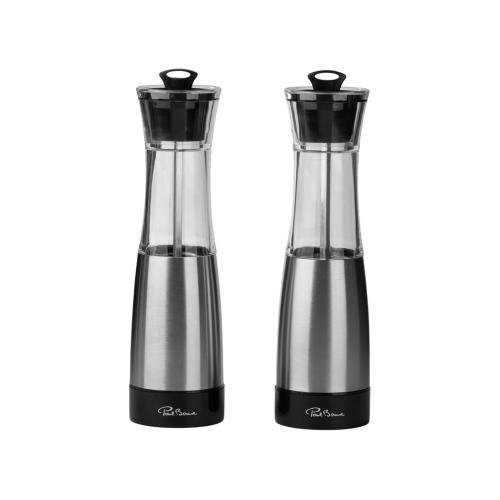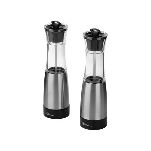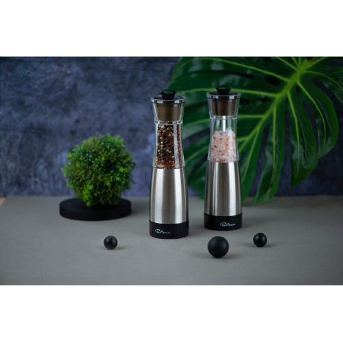 В комплект входят две мельницы, оснащенные высококачественным керамическим механизмом, который обеспечивает равномерное и эффективное измельчение специй. Приводятся в действие вручную, что позволяет легко контролировать степень помола. Изготовлены из прочной нержавеющей стали с элементами прозрачного акрила, что придаёт набору современный и элегантный вид.