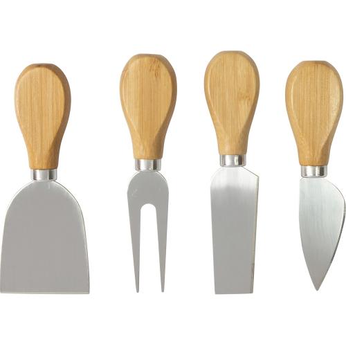 Листовидный нож или, как его еще называют, нож для пармезана, предназначен для твердых сортов сыра, которые практически невозможно порезать, скорее их нужно колоть. Нож-стамеска предназначен для очень мягких сыров, а широкая лопатка — для мягких и полутвердых. Двузубая вилка используется для сервировки, а также помогает при нарезании.