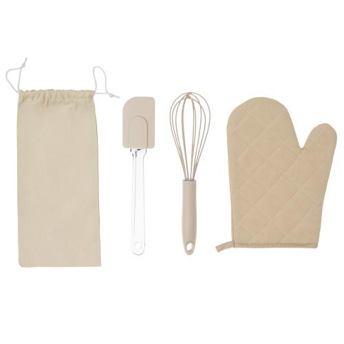 Набор Canele состоит из трёх предметов, без которых не обходится приготовление ни одного пирога или торта: венчика для взбивания яиц или крема, лопатки и прихватки для горячего.
