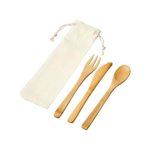 Набор столовых приборов Celuk из бамбука. Набор столовых приборов из бамбука состоит из вилки, ножа и ложки. Поставляется в нетканом мешочке. Бамбук.
