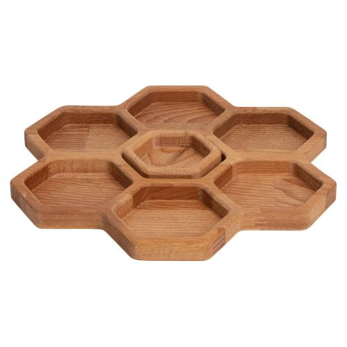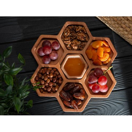 Менажница выполнена в виде семи сот для разных видов закусок — за бонусную дополнительную отвечает съемная сота-соусница, в которую можно залить мед или любимый соус.