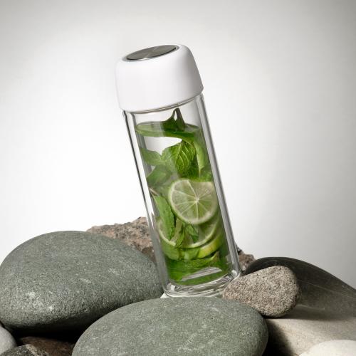 Стеклянная бутылка с двойными стенками позволит носить свежезаваренный чай с собой. Ситечко позволит заварить чай прямо в бутылке.