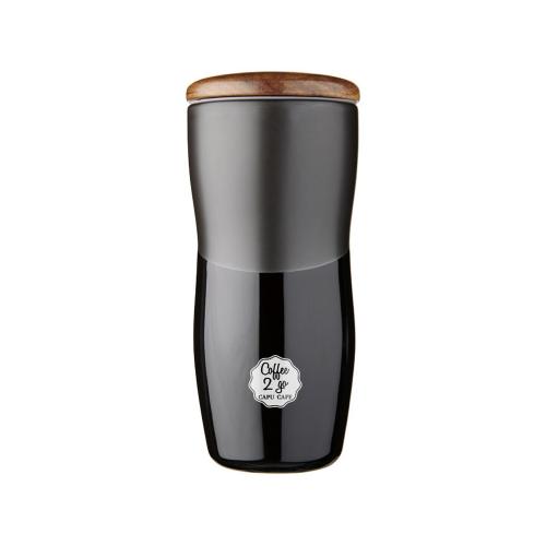 Двустенная керамическая термокружка Reno объемом 370 мл. Двустенная керамическая термокружка с контрастным дизайном из матового и блестящего покрытия. Кроме того, двустенная керамическая конструкция препятствует образованию конденсата на внешней стороне стакана. Оснащена деревянной нажимной крышкой.